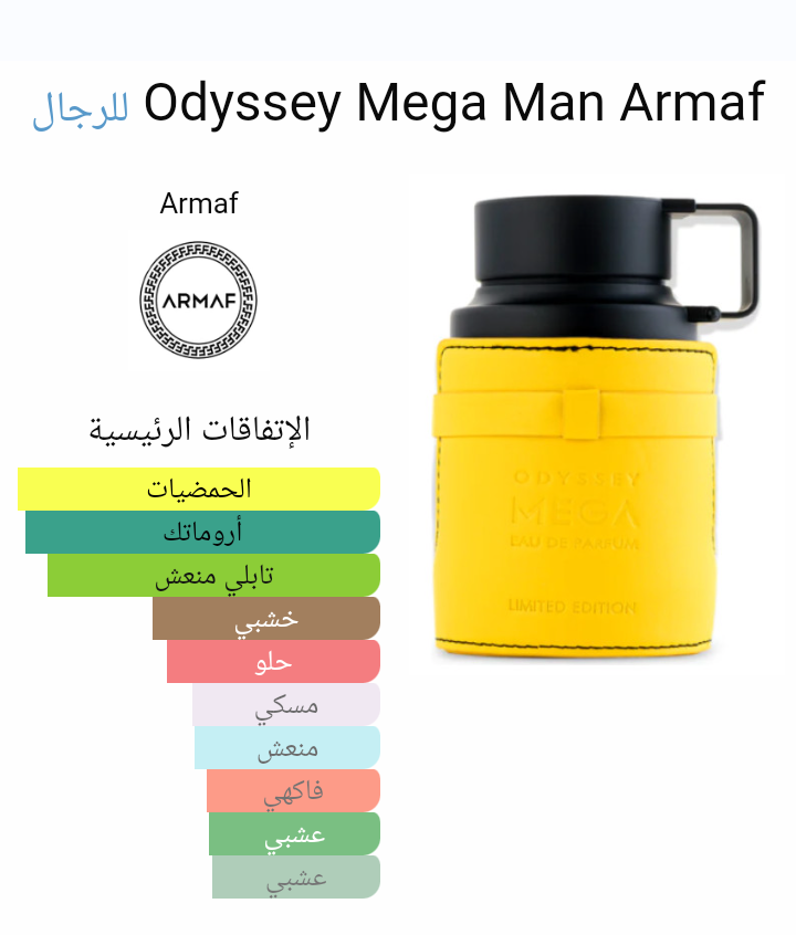 Odyssey Mega Man Armaf عطر خشبي - أروماتك للرجال . هذا عطر جديد Odyssey Mega Man صدر عام 2023. إفتتاحية العطر البرتقال, البرغموت, الليمون, الزنجبيل و النعناع; قلب العطر الأناناس, العرعر, إبره الراعي و المريمية; قاعدة العطر تتكون من المسك, حبوب التونكا, خشب الأرز و نجيل الهند.
