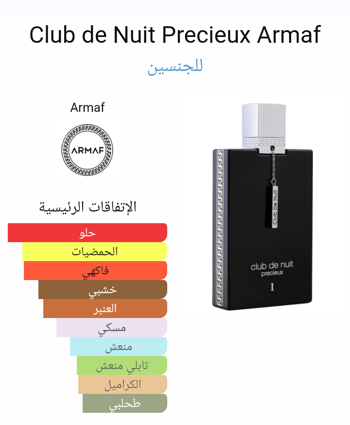 عطر شرقي - خشبي للجنسين. هذا عطر جديد Club de Nuit Precieux صدر عام 2024. إفتتاحية العطر الأناناس, الليمون, البرغموت, الكاراميل, الكمثري, الفلفل الوردي و الفلفل الأسود; قلب العطر طحلب البلوط (طحلب السنديان), الأخشاب, الياسمين, الينسون و زنابق الوادي; قاعدة العطر تتكون من الأمبروكسان, العنبر, الفانيليا, المسك الأبيض, خشب الأرز, الباتشولي و الجلود.