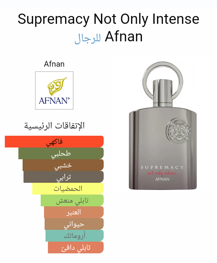 Supremacy Not Only Intense Afnan عطر شرقي - حار للرجال . Supremacy Not Only Intense صدر عام 2021. إفتتاحية العطر الكشمش الأسود, البرغموت و التفاح; قلب العطر طحلب البلوط (طحلب السنديان), الباتشولي و الخزامي; قاعدة العطر تتكون من الآمبرغريس, المسك و الزعفران.