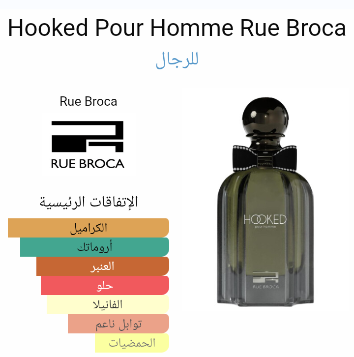 Hooked Pour Homme Rue Broca عطر شرقي - فانيليا للرجال . هذا عطر جديد Hooked Pour Homme صدر عام 2024. إفتتاحية العطر الكاراميل و المريمية; قلب العطر العنبر, الحمضيات و الفانيليا; قاعدة العطر تتكون من حبوب التونكا و نجيل الهند.