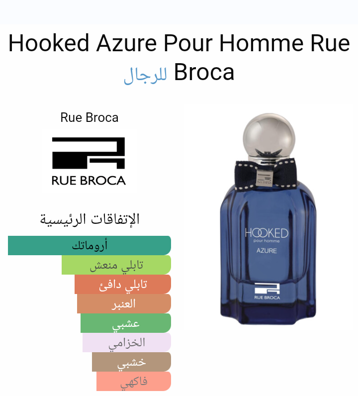 عطر أروماتك - فوچير للرجال . هذا عطر جديد Hooked Azure Pour Homme صدر عام 2024. إفتتاحية العطر الخزامي, الهيل و الكمثري; قلب العطر النعناع الحار, إكليل الجبل و القرفة; قاعدة العطر تتكون من العنبر, الأفسنتين نبات و نجيل الهند.
