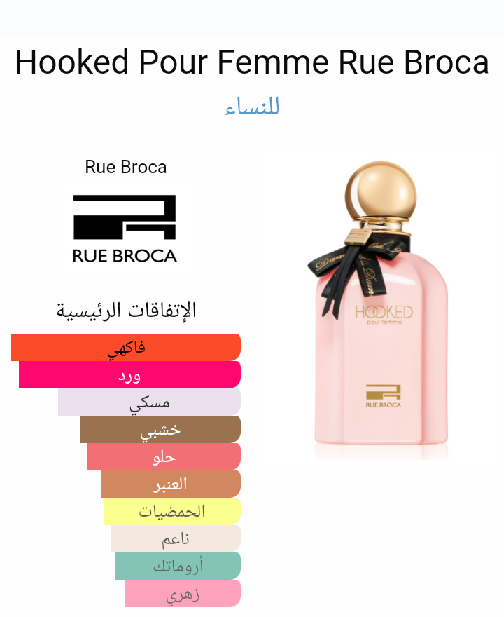 Hooked Pour Femme Rue Broca عطر للنساء . Hooked Pour Femme صدر خلال 2020's. إفتتاحية العطر توت العليق, البرغموت و الفلفل الوردي; قلب العطر الورد, الأخشاب و أشجار السرو; قاعدة العطر تتكون من المسك, العنبر و نجيل الهند.