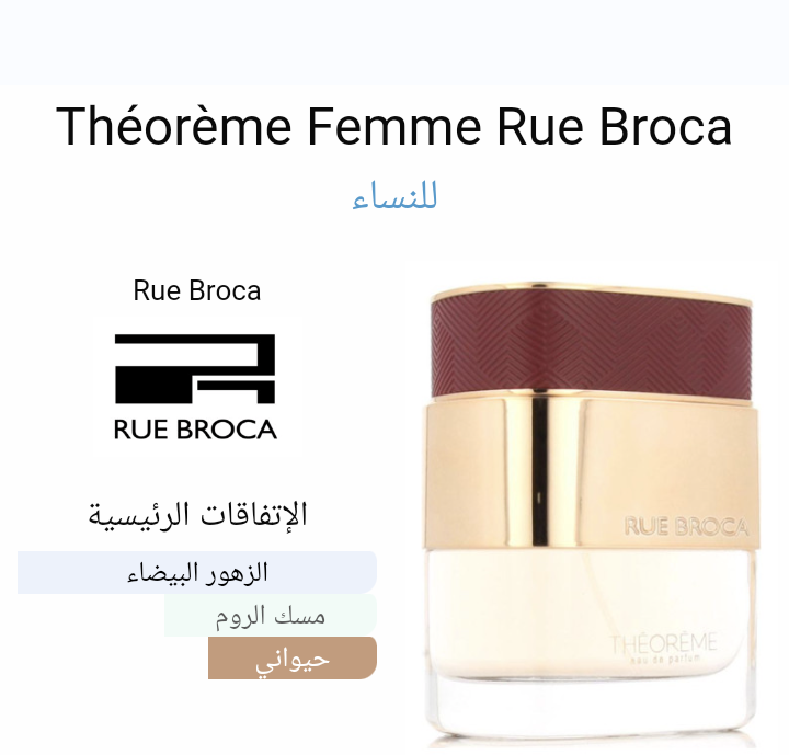 Théorème Femme Rue Broca عطر شرقي - زهري للنساء . هذا عطر جديد Théorème Femme صدر عام 2022. إفتتاحية العطر الزهور البيضاء و البرغموت; قلب العطر مسك الروم و الياسمين; قاعدة العطر تتكون من المسك, الفانيليا و خشب الأرز.