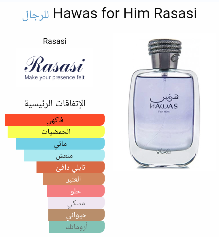 عطر أروماتك - مائي للرجال . Hawas for Him صدر عام 2015. إفتتاحية العطر التفاح, البرغموت, الليمون و القرفة; قلب العطر رائحه الماء, البرقوق, الهيل و زهر البرتقال; قاعدة العطر تتكون من الآمبرغريس, المسك, الباتشولي و الأخشاب الطافية.