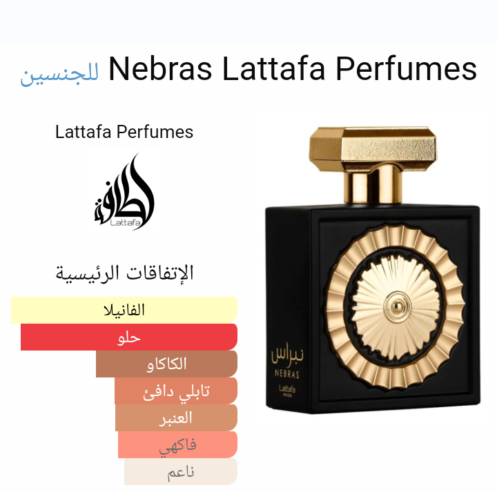Nebras Lattafa Perfumes عطر شرقي - فانيليا للجنسين. هذا عطر جديد Nebras صدر عام 2022. إفتتاحية العطر التوت الأحمر و الماندرين (اليوسفي); قلب العطر الفانيليا, الكاكاو و الورد; قاعدة العطر تتكون من السكر, حبوب التونكا, العنبر و المسك.