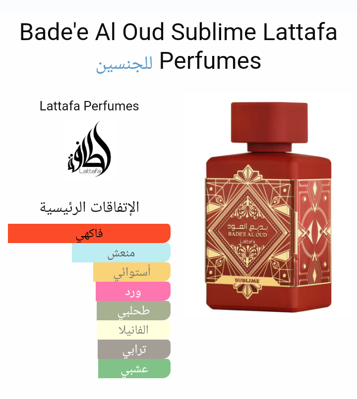 Bade'e Al Oud Sublime Lattafa Perfumes عطر خشبي - أروماتك للجنسين. هذا عطر جديد Bade'e Al Oud Sublime صدر عام 2023. إفتتاحية العطر التفاح, الليتشي و الورد; قلب العطر البرقوق و الياسمين; قاعدة العطر تتكون من الفانيليا, الطحالب و الباتشولي