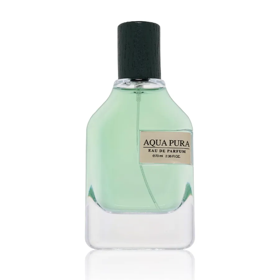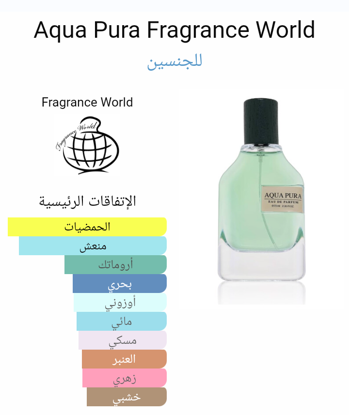 Aqua Pura Fragrance World عطر حمضيات - أروماتك للجنسين. Aqua Pura صدر عام 2023. إفتتاحية العطر الليمون و البرغموت; قلب العطر جزئ الكالون, الطحالب البحرية و جزئ هديون; قاعدة العطر تتكون من الأمبروكسان, خشب الأرز و المسك.