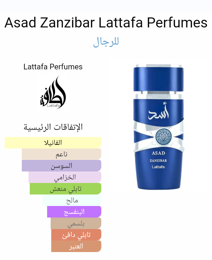 Asad Zanzibar Lattafa Perfumes عطر للرجال . هذا عطر جديد Asad Zanzibar صدر عام 2024. Fanny Bal قام بتوقيع هذا العطر. إفتتاحية العطر الخزامي و الفلفل الأسود; قلب العطر ماء جوز الهند, السوسن و الملح; قاعدة العطر تتكون من الفانيليا و البخور.