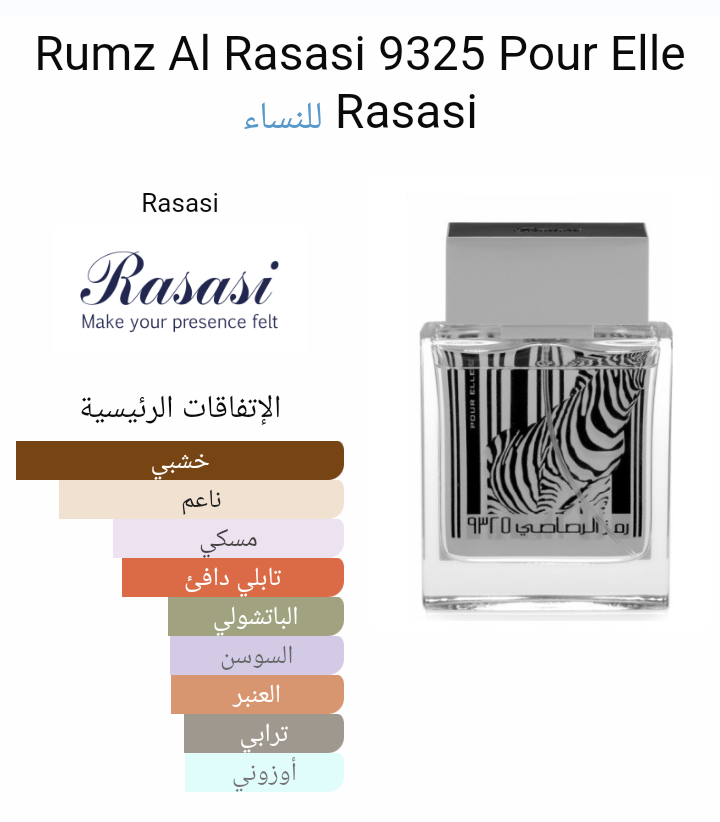 Rumz Al Rasasi 9325 Pour Elle Rasasi عطر للنساء . Rumz Al Rasasi 9325 Pour Elle صدر عام 2014. إفتتاحية العطر أوراق البنفسج و القرنفل; قلب العطر خشب الأرز و السوسن; قاعدة العطر تتكون من المسك, الباتشولي, العنبر, خشب الصندل و الفانيليا