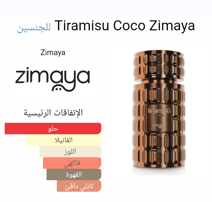 Tiramisu Coco Zimaya عطر شرقي - فانيليا للجنسين. هذا عطر جديد Tiramisu Coco صدر عام 2024. إفتتاحية العطر شراب الأماريتو و القهوه; قلب العطر البسكويت, الأيس كريم و الفانيليا; قاعدة العطر تتكون من الفانيليا, السكر البني و العنبر.