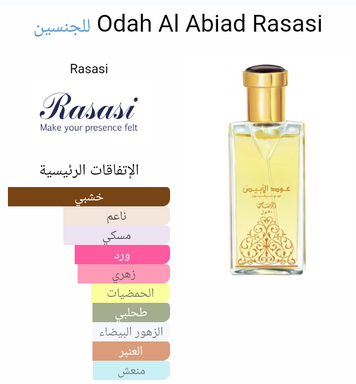 Odah Al Abiad Rasasi عطر شرقي للجنسين. إفتتاحية العطر الورد, البرغموت و رائحه التوابل; قلب العطر الأخشاب, خشب الصندل, زنابق الوادي, الليلك و خشب الأرز; قاعدة العطر تتكون من المسك, الأخشاب, طحلب البلوط (طحلب السنديان) و العنبر.