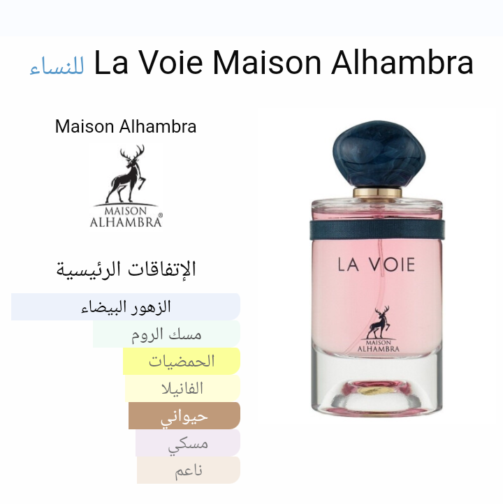 La Voie Maison Alhambra عطر زهري للنساء . La Voie صدر عام 2022. إفتتاحية العطر زهر البرتقال و البرغموت; قلب العطر مسك الروم و الياسيمين الهندي; قاعدة العطر تتكون من فانيليا مدغشقر, المسك الأبيض و خشب الأرز من فرجينيا