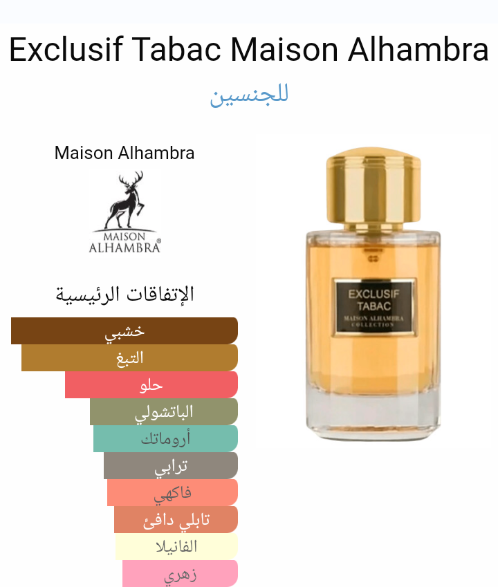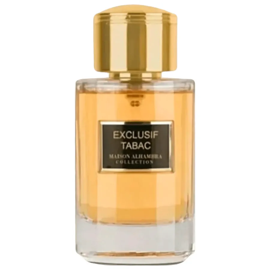 Exclusif Tabac Maison Alhambra عطر شرقي - خشبي للجنسين. Exclusif Tabac صدر عام 2022. إفتتاحية العطر أوسمانثوس , الزنجبيل, الحمضيات و الشيح; قلب العطر التبغ, الباتشولي, أخشاب الغاياك و نجيل الهند; قاعدة العطر من حبوب التونكا.