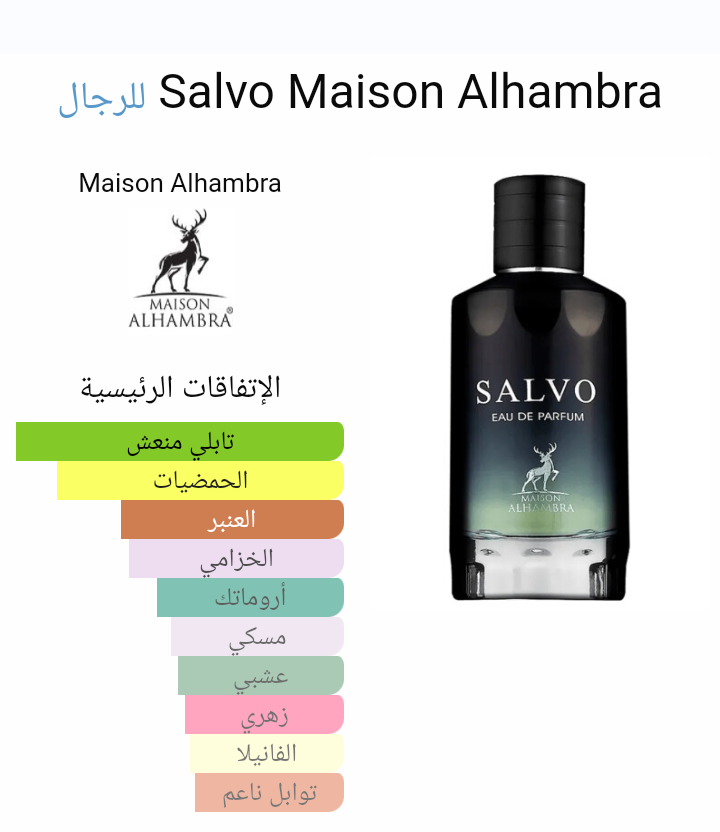 Salvo Maison Alhambra عطر شرقي - فوچير للرجال . Salvo صدر عام 2022. إفتتاحية العطر البرغموت; قلب العطر الخزامي, فلفل سيشوان, الينسون النجمي و جوزه الطيب; قاعدة العطر تتكون من الأمبروكسان و الفانيليا