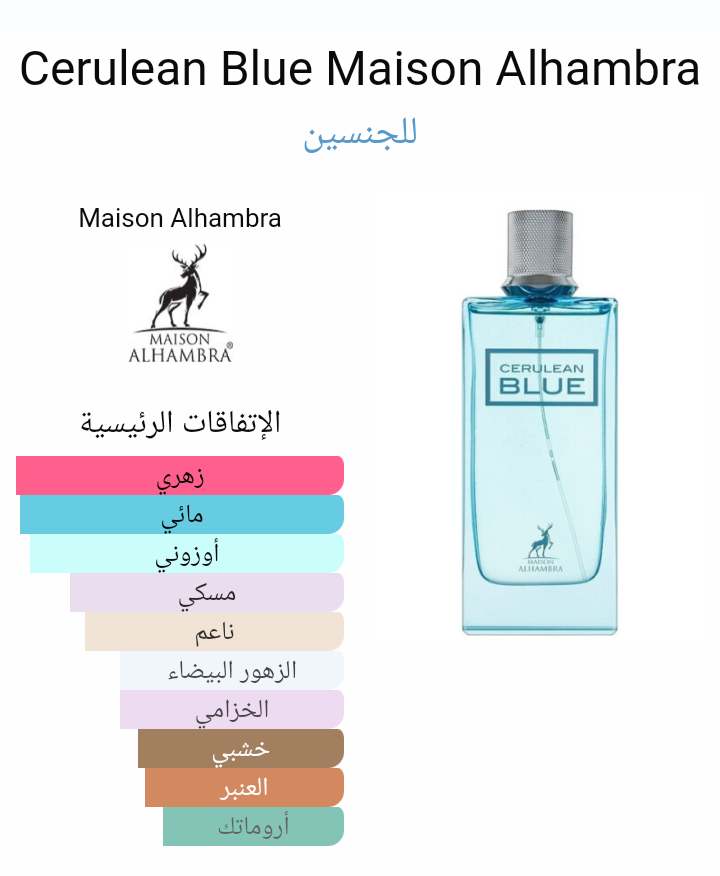 Cerulean Blue Maison Alhambra عطر أروماتك - مائي للجنسين. Cerulean Blue صدر عام 2022. إفتتاحية العطر البطيخ, الخزامي و البرغموت; قلب العطر اللوتس و الياسمين; قاعدة العطر تتكون من المسك, خشب الصندل و العنبر.