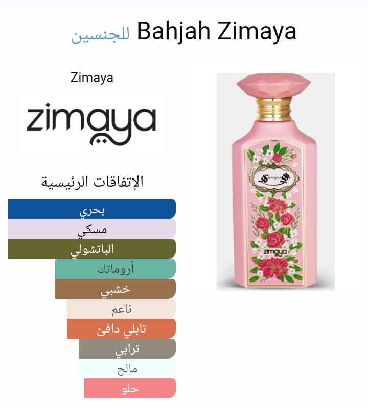 Bahjah Zimaya عطر للجنسين. هذا عطر جديد Bahjah صدر عام 2024. إفتتاحية العطر نسيم البحر, الزهور البيضاء و النوتات الزهرية; قلب العطر الباتشولي, لاكتونات و نوتات الفواكه; قاعدة العطر تتكون من المسك و حلوي.