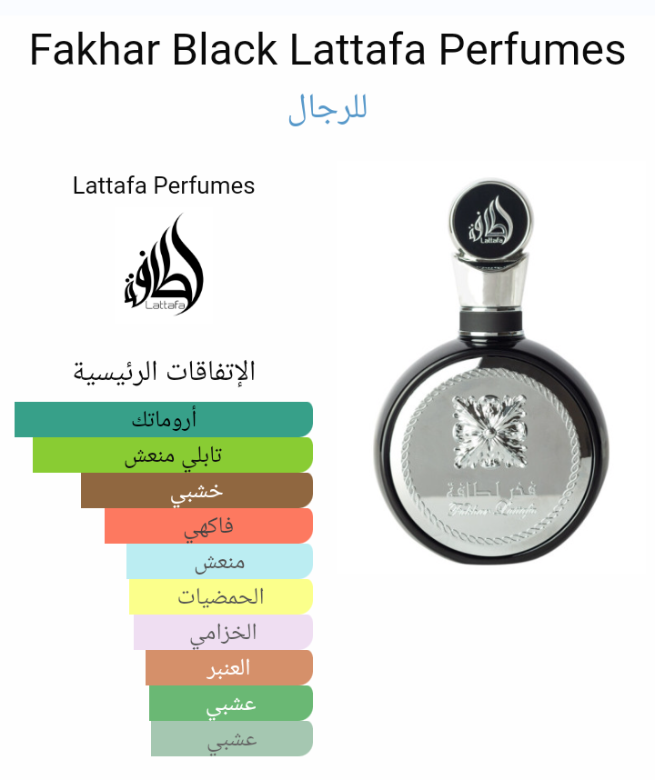 Fakhar Black Lattafa Perfumes عطر شرقي للرجال . هذا عطر جديد Fakhar Black صدر عام 2022. إفتتاحية العطر التفاح, البرغموت و الزنجبيل; قلب العطر الخزامي, المريمية, توت العرعر و إبره الراعي; قاعدة العطر تتكون من حبوب التونكا, خشب الأرز, خشب العنبر و نجيل الهند.