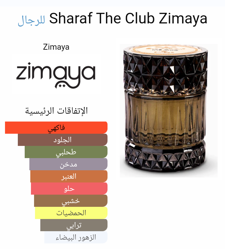 Sharaf The Club Zimaya عطر أروماتك - فواكه للرجال . هذا عطر جديد Sharaf The Club صدر عام 2023. إفتتاحية العطر الأناناس, التفاح, البرغموت و الزهور البيضاء; قلب العطر أخشاب البتولا, العنبر و زهر البرتقال; قاعدة العطر تتكون من طحلب البلوط (طحلب السنديان), الآمبرغريس و المسك.