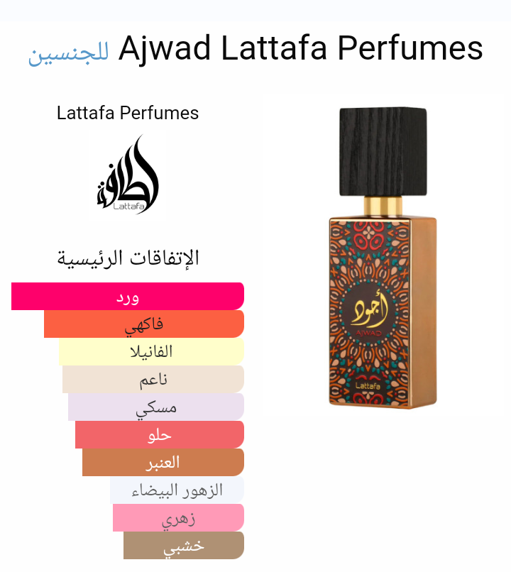 Ajwad Lattafa Perfumes عطر خشبي - أروماتك للجنسين. Ajwad صدر عام 2021. إفتتاحية العطر نوتات الفواكه; قلب العطر الورد و الياسمين; قاعدة العطر تتكون من الفانيليا, المسك, العنبر و خشب الأرز.