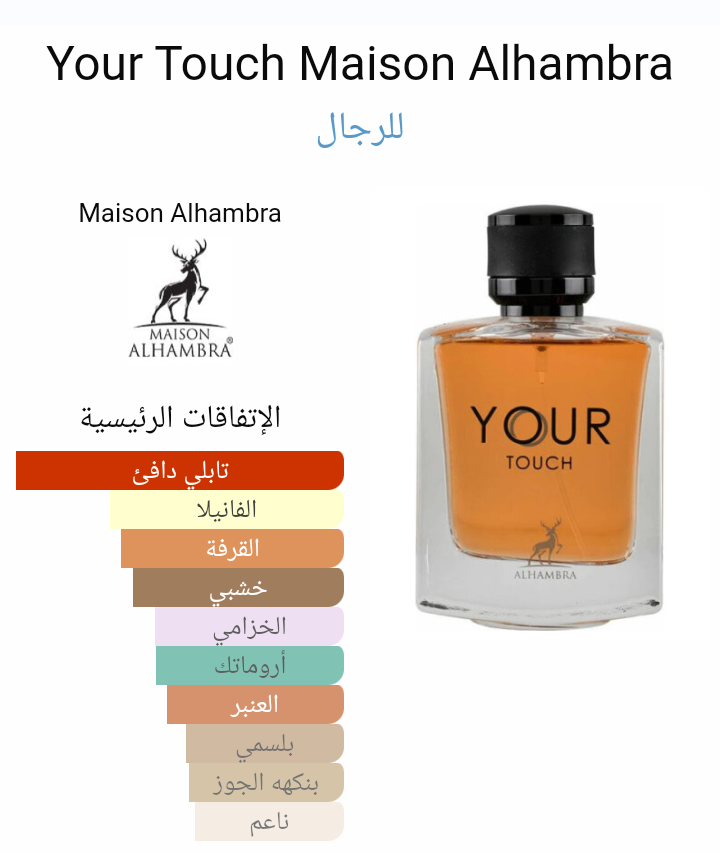 Your TouchMaison Alhambra عطر شرقي للرجال . Your Touch صدر عام 2022. إفتتاحية العطر الهيل, أوراق البنفسج, الفلفل الوردي و النعناع; قلب العطر القرفة, الخزامي, المريمية, البطيخ و الأناناس; قاعدة العطر تتكون من الكستناء, الفانيليا, خشب العنبر, أخشاب الغاياك و خشب الأرز.